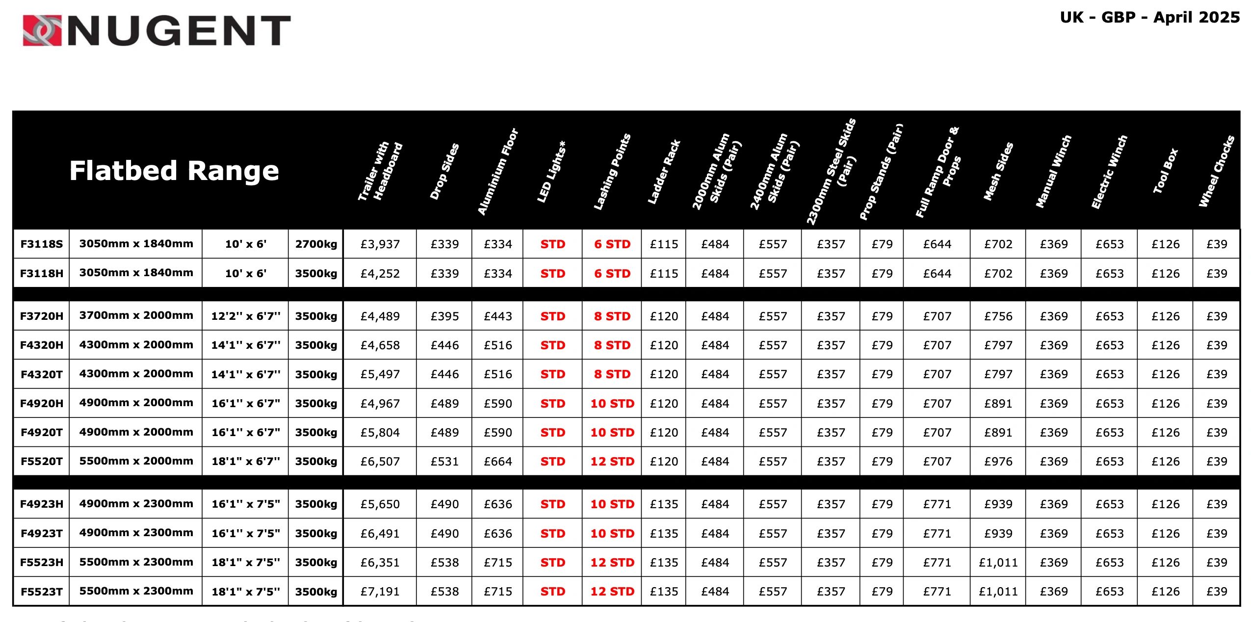 The Nugent flatbed range is unrivalled in terms of build quality. They are renowned for being some of the most heavy duty flatbed trailers available and boast many market leading features as standard including recessed tie down rings located in the two steel runners along the trailer bed for extra durability, exterior tying points, heavy duty spring loaded spring loaded flip latches on the dropsides, spare wheel, LED lights, lockable hitch, ramp carrier, lockable ramp storage, serrated jockey wheel and the market leading Nugent dual drive suspension meaning they tow brilliantly and do not shake, rattle and bounce like other brands!